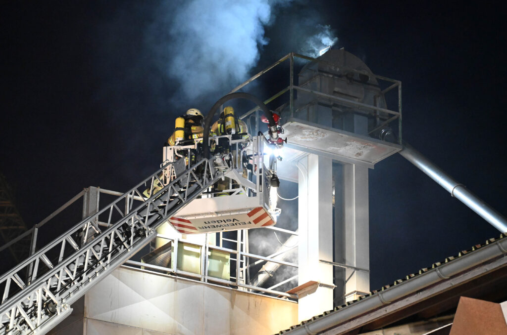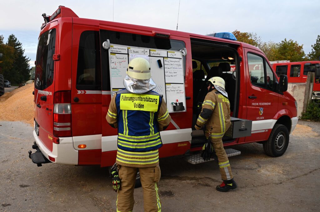 Um eine unabhängige Wasserversorgung zu errichten, wurde die Feuerwehr Wurmsham mit der 500 Meter Schlauch Komponente nachgefordert, welche eine Tragkraftspritze an einem Löschweiher in Stellung brachte. Durch die SEG-Verpflegung der Malteser Velden wurde die Verpflegung der Einsatzkräfte sichergestellt. Nachdem das Brandgut nicht mehr nach rieselte, entschied man sich nach einer Lagebesprechung den Siloturm punktuell zu öffnen, damit die aufgestaute Hitze entweichen kann. Mittels Werkzeug wurde der Turm von der Drehleiter aus unter Atemschutz geöffnet und Löscharbeiten durchgeführt.